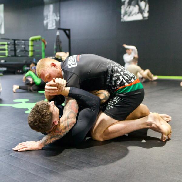 Submission Grappling focuses on dominating positions and finishing holds without relying on clothing grips. Sessions start with wrestling‑based takedowns and clinch work, then progress to ground control, transitions and submissions such as chokes, armbars, kimuras and leg‑locks.